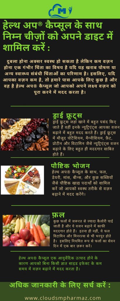 हेल्थ अप® कैप्सूल शरीर के वज़न को प्राकृतिक तरीके से बढ़ाने में मदद करता है। ये कैप्सूल व्यक्ति की सहनशक्ति, ताकत और वज़न में सुधार करने में मदद करते हैं। हेल्थ अप® कैप्सूल में 16 आदिम जड़ी-बूटियों की संतुलित मात्रा होती है, जो शरीर के सभी दोषों को शांत करने में मदद करती है। हेल्थ अप® कैप्सूल आयुर्वेदिक विज्ञान और आधुनिक विज्ञान के दोहरे दृष्टिकोण से काम करता है जिसमें जड़ी-बूटियों का उपयोग चया-पचय की अति सक्रियता को कम करने के लिए किया जाता है जो कि खाद्य सामग्री से पोषक तत्वों को सक्रिय रूप से अवशोषित करने के लिए आवश्यक है और उस उद्देश्य के लिए उच्च स्तर की ऊर्जा की आवश्यकता होती है।
