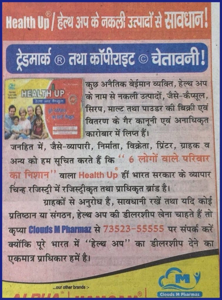 While purchasing Health Up® Capsules, always make sure that you buy Health Up® only with Registered Trademark (® denotes Registered Trademark Product in the Trademark Authority of India).